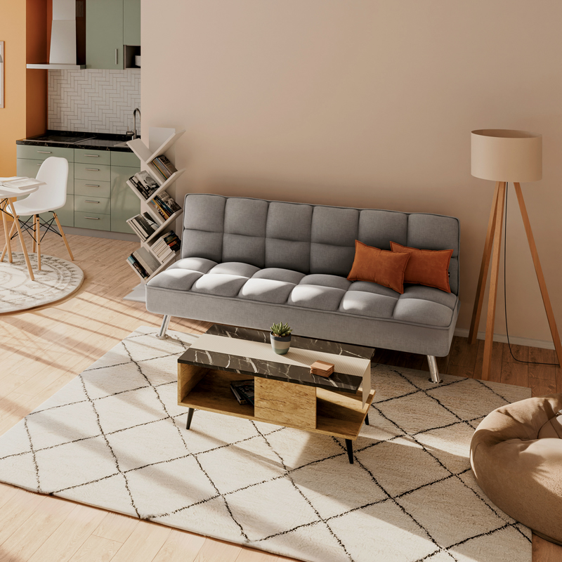 - Φέρει εύχρηστο μεταλλικό μηχανισμό «click-clack» που με μία μόνο κίνηση μετατρέπει τον καναπέ σε κρεβάτι και το αντίστροφο.