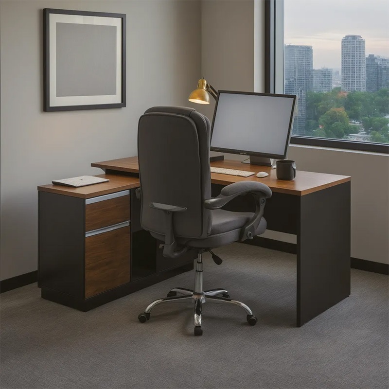 Αναζητάς ένα γραφείο διεύθυνσης που να εκπέμπει κύρος, δύναμη και υπεροχή; Αν ναι τότε η σειρά Oscar είναι ότι χρειάζεσαι για να ολοκληρώσεις την εικόνα της επιχείρησης σου. Γραφείο διεύθυνσης με ενσωματωμένο γωνιακό ερμάριο (στη αριστερή πλευρά), στον εντυπωσιακό χρωματισμό του καρυδί – ανθρακί. Κατασκευασμένο από υλικά υψηλών προδιαγραφών και σύμφωνα με τις εργονομικές απαιτήσεις του σήμερα.