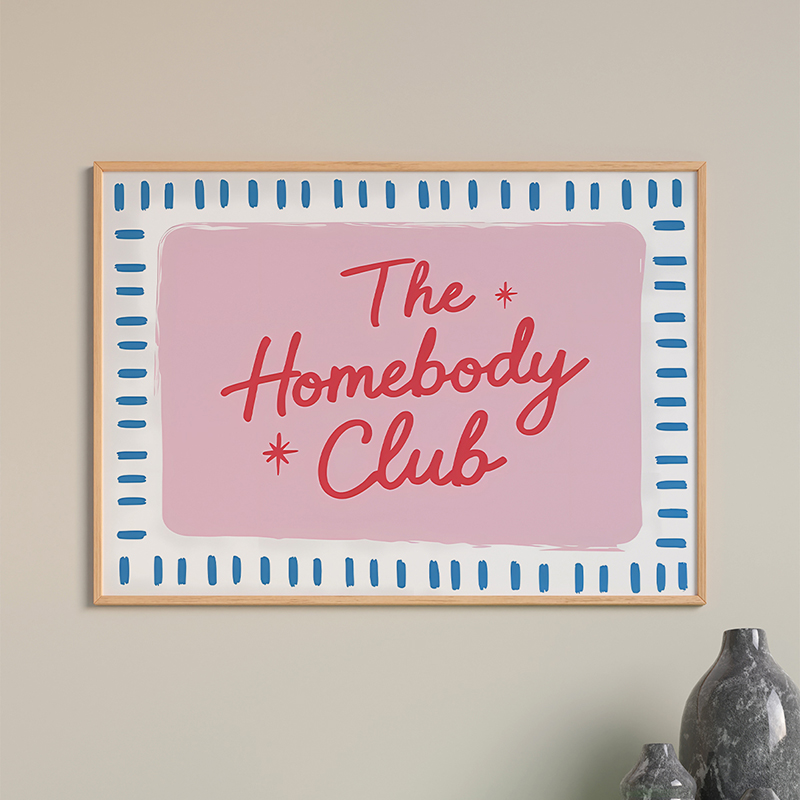 Δώστε έναν παιχνιδιάρικο και φιλικό τόνο στον χώρο σας με τον μοντέρνο πίνακα Dineria. Ο πίνακας αυτός φέρει το μήνυμα “The Homebody Club” σε γραμματοσειρά που θυμίζει χειρόγραφο, πάνω σε ένα φόντο από απαλό ροζ με μπλε ρίγες περιμετρικά. Είναι το τέλειο statement piece για όσους αγαπούν να περνούν χρόνο στο σπίτι και προσθέτει μια νεανική, Pop-Art αισθητική στο σαλόνι, το γραφείο ή το υπνοδωμάτιο.