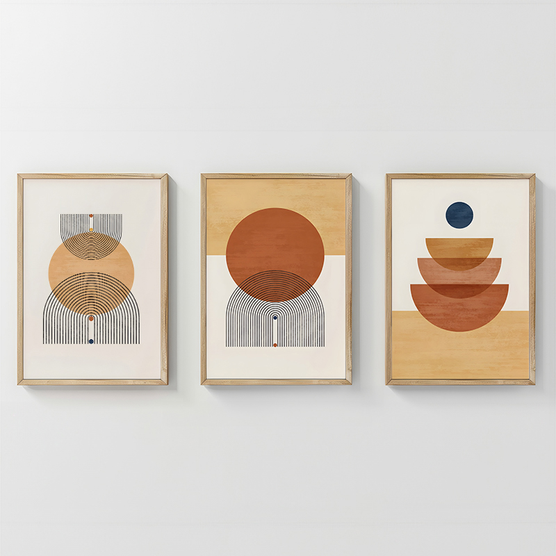 Εισάγετε στον χώρο σας την τάξη και τη γαλήνη της minimal γεωμετρίας, με μία σύνθεση που αποπνέει ζεστασιά και διακριτική πολυτέλεια. Το τρίπτυχο Mireta αποτελείται από τρία ξεχωριστά, αλληλεπιδρώντα τεμάχια. Κάθε πίνακας παρουσιάζει αφηρημένα γεωμετρικά σχήματα – κύκλους, ημικύκλια και τόξα – τα οποία είναι στοιβαγμένα, δημιουργώντας μια αίσθηση αρχιτεκτονικής δομής και ισορροπίας. Αυτή η τριπλή διάταξη προσδίδει βάθος, δυναμισμό και υψηλή αισθητική στον χώρο.